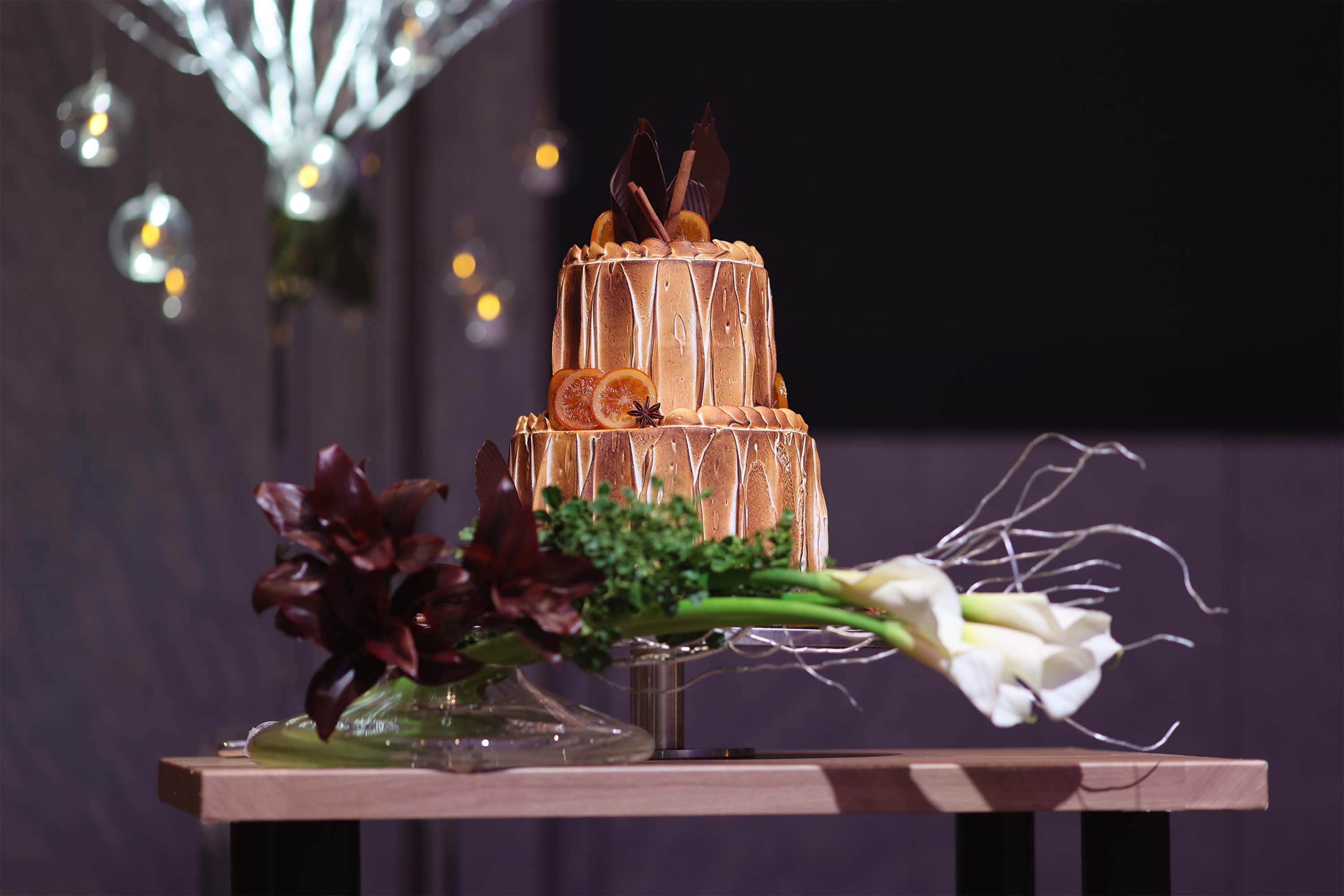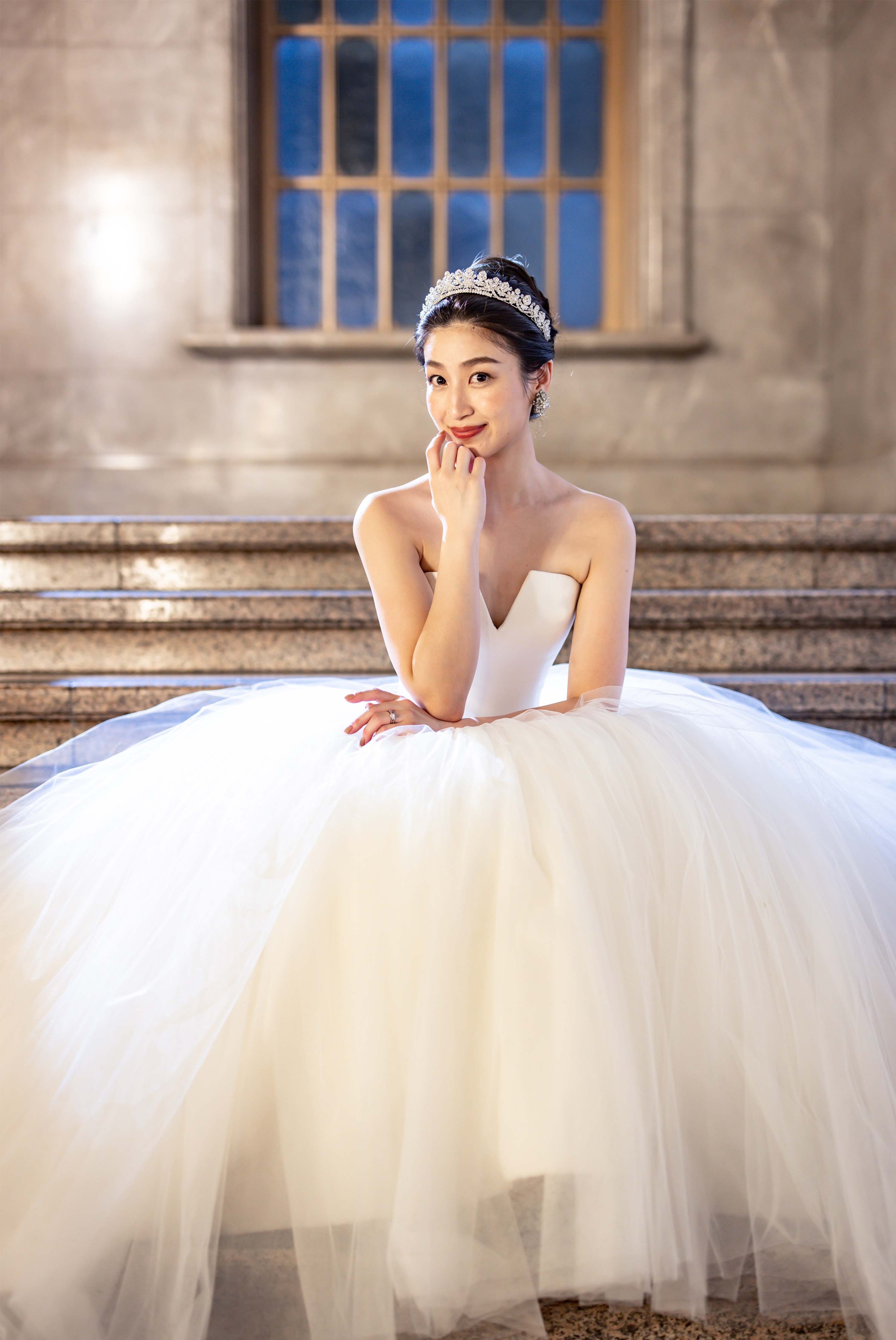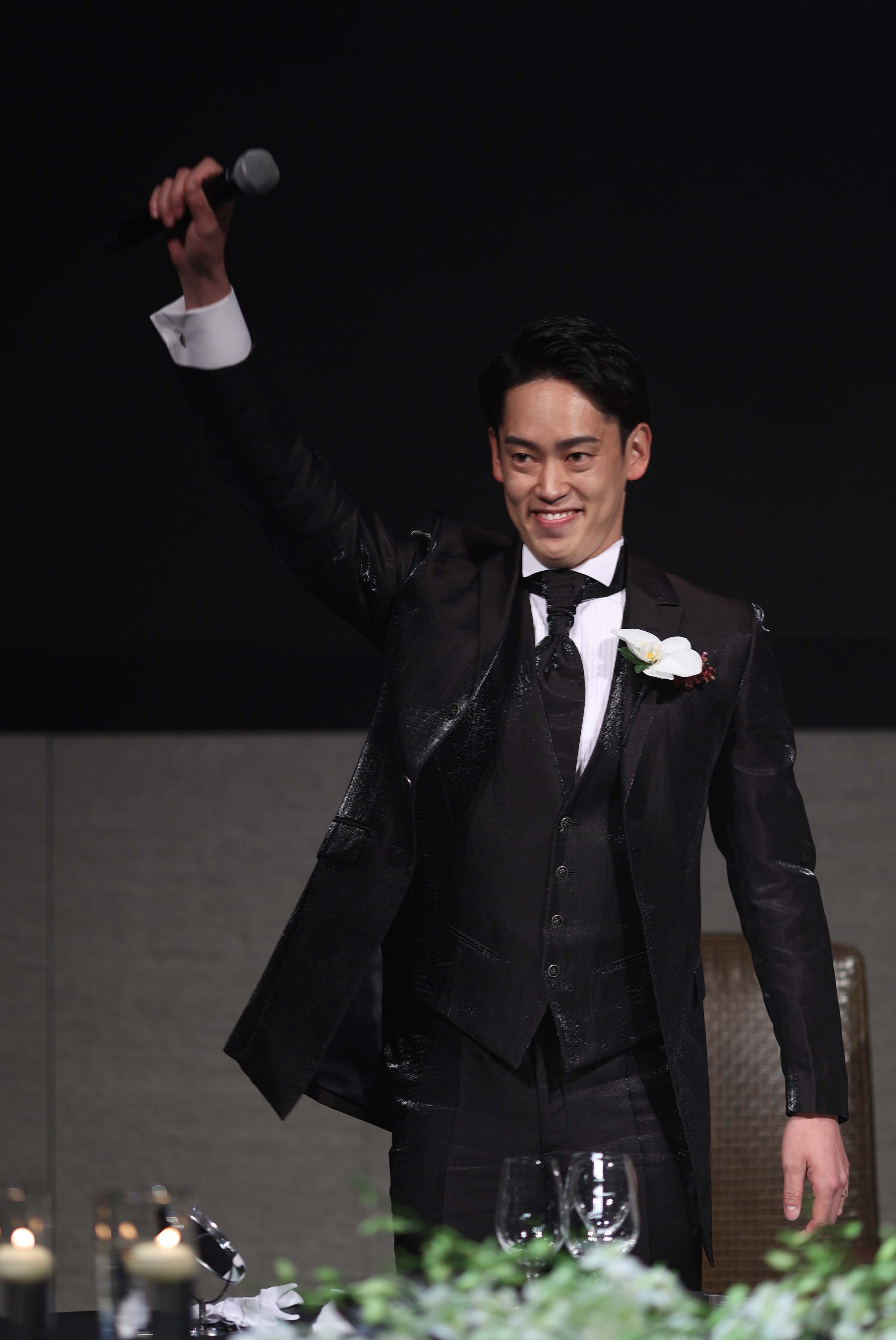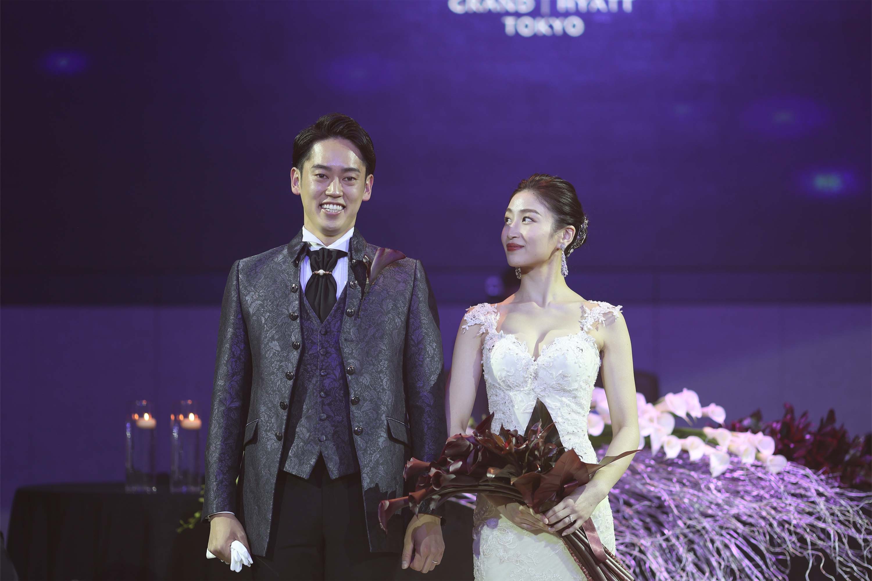 「野球をしていたので下半身に安定感がある」ことから、自宅でもウォーキングレッスンは怠らず、体形に気を付けたそう。そして選んだ衣装はウエストを強調したスリムでシャープなシルエットが特徴の『カルロ・ピニャテッリ(CARLO PIGNATELLI)』のウエディングスーツ。挙式での1着目は角度によって、光沢を感じる華やかなデザイン。