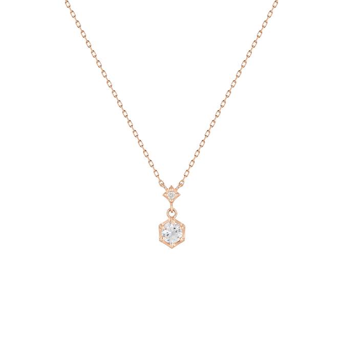 舞い散る雪の粒をイメージし、小さなダイヤモンドと透明感あるトパーズを組み合わせた揺れるK10ピンクゴールドネックレスです。