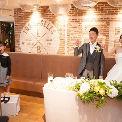 木目調の温かな空間。自然光が降り注ぐ明るい会場は、窓一面から望む緑と、そこから降り注ぐ陽光もふたりを祝福。 木や石を使った温かな空間で、ゲストとの会話も弾む。ダイニングに面した緑溢れるテラスに出れば、ゲストとお二人も自然な笑顔に。